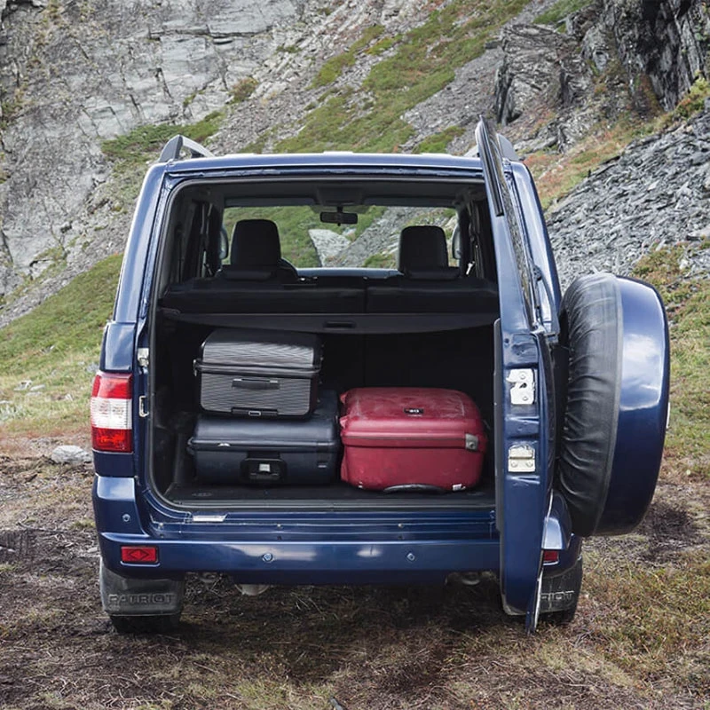 Брызговики (передние и задние) Решетка радиатора с хромированными элементами Передний бампер, задний бампер, молдинги и пороги в цвет кузова Диски стальные 16" с шинами 225/75 R16, запасное колесо со стальным диском Объемные шильдики с эффектом металлических букв Patriot Атермальные стекла (зеленые)